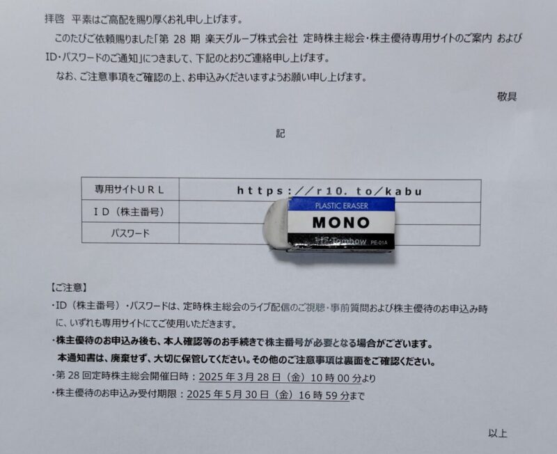 2025年の楽天の株主優待の資料が来た際、私の場合は株主総会への参加視聴のためのIDパスワードと勘違いしており、申し込みにも使うと思っていませんでした。